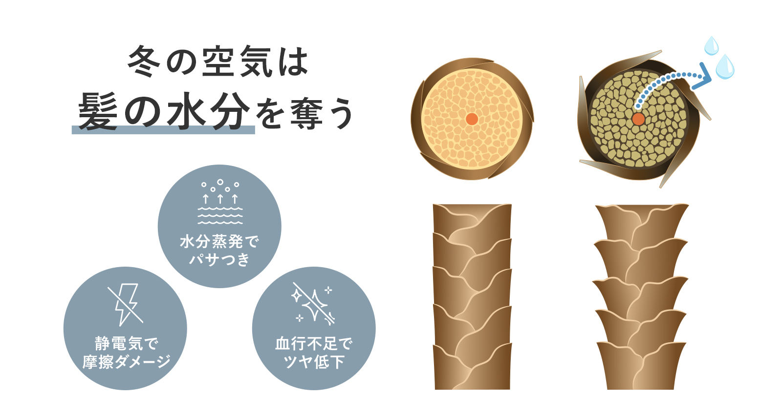 乾燥した空気は、髪内部の水分を奪い、髪表面を覆うキューティクルを浮き上がらせます。