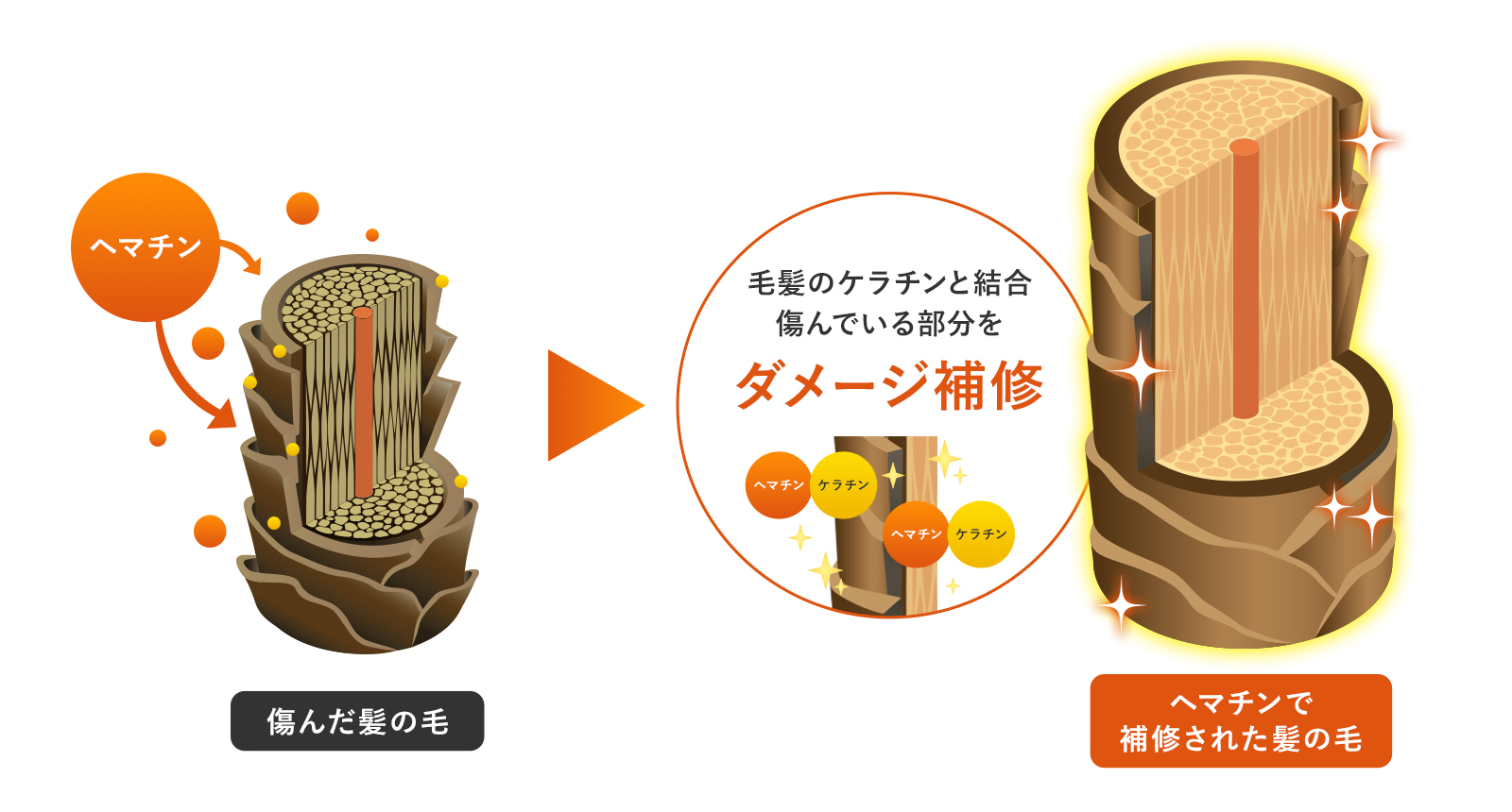 そんな髪内部のタンパク質に働きかけ、ダメージを補修しながら髪本来のしなやかさを取り戻すサポートをしてくれる成分が「ヘマチン」です。
