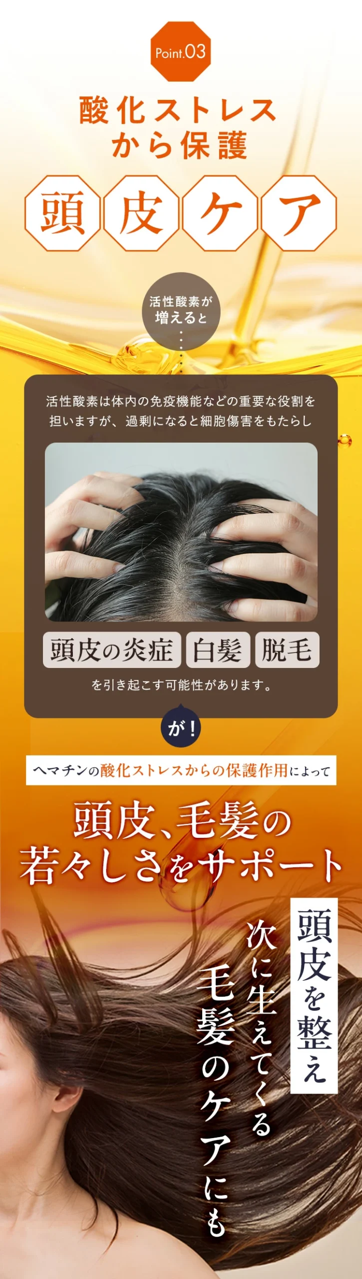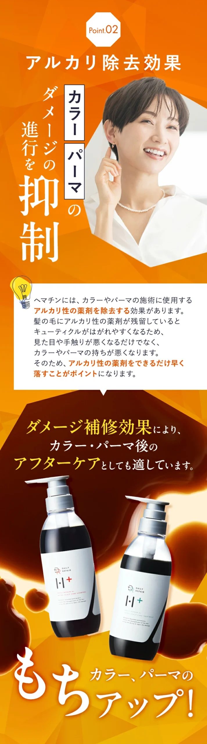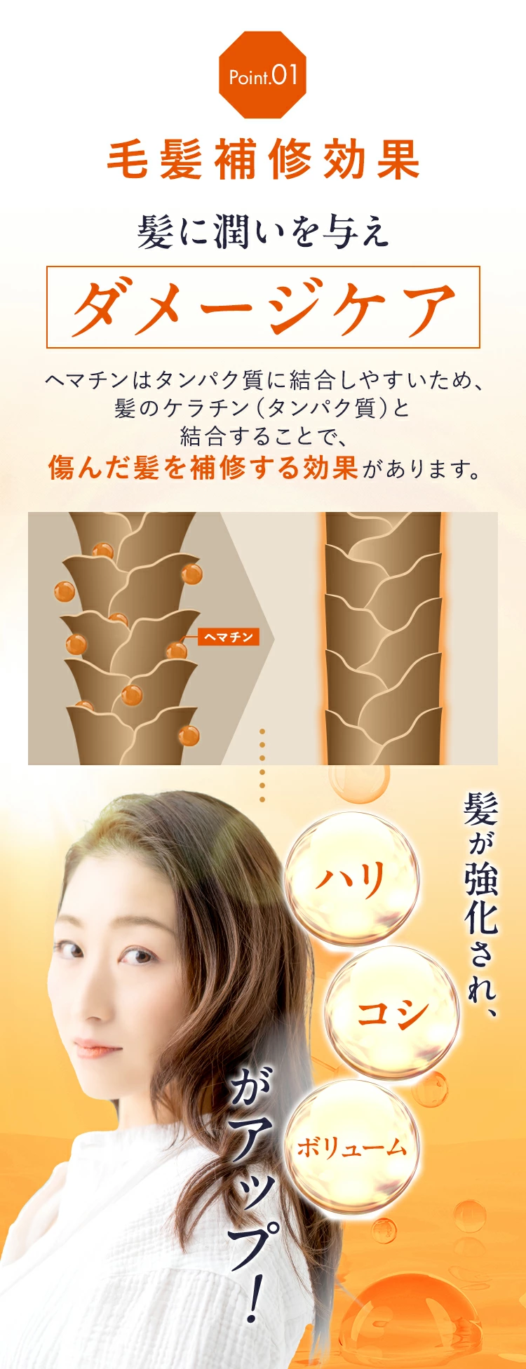 ヘマチンを中心とした高機能処方で、ツヤ・まとまり・ボリュームのある美髪へ。